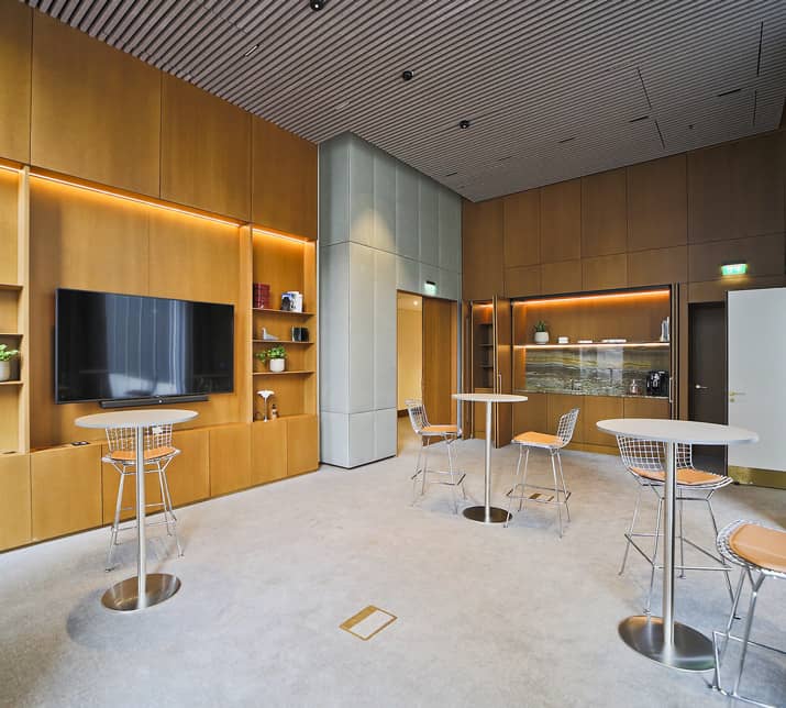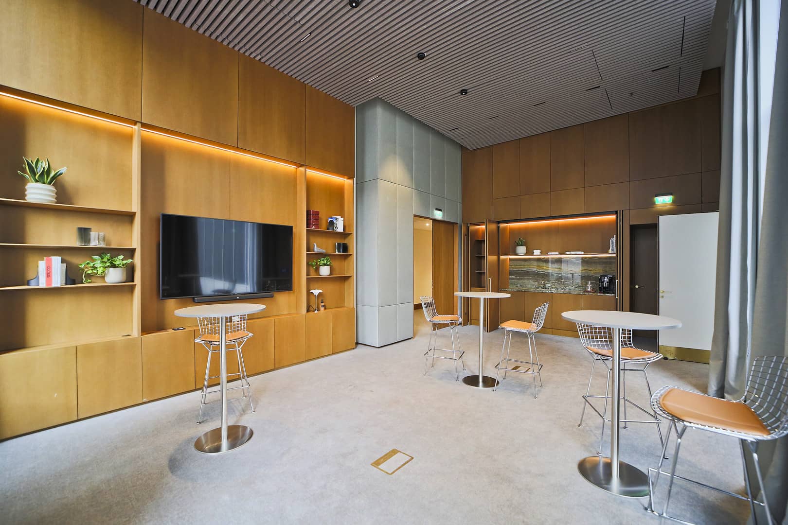 Le business center est spacieux et profite de belles hauteurs sous plafond. Il se compose de deux grandes salles de réunion de 20 et 24 places, dont une éclairée naturellement comme l’amphithéâtre de 80 places. Il accueillera également deux salles de wellness dédiées au bien-être des usagers (salon de coiffure, massages...)